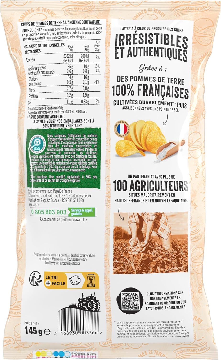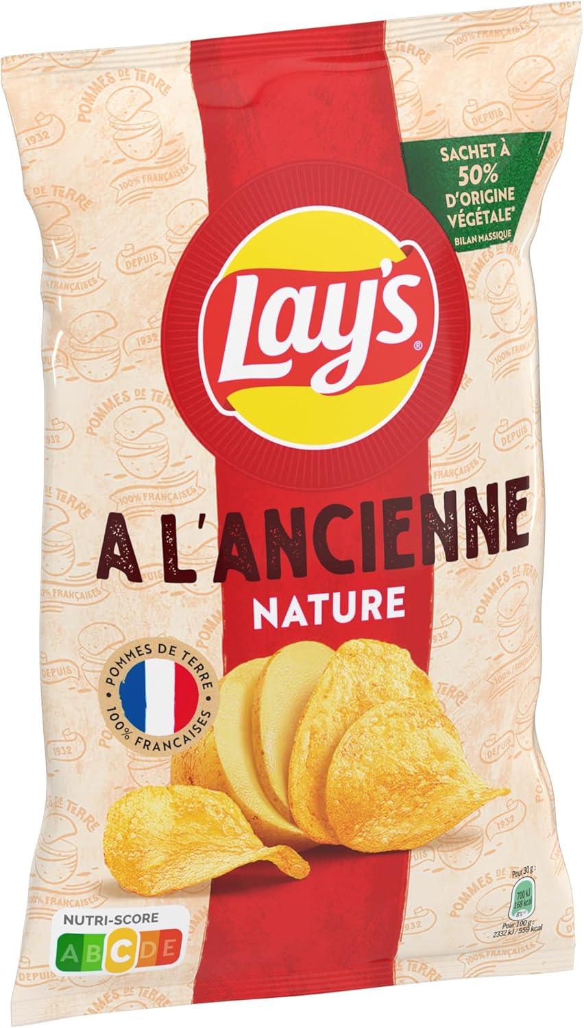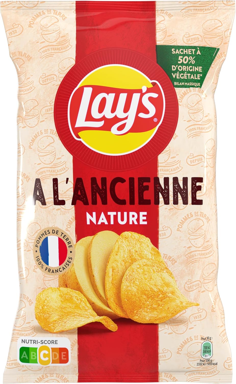 - DES CHIPS FRANÇAISES : Notre gamme Lay’s Recette à l’Ancienne est entièrement produite à partir de pommes de terre 100% Françaises. Nous sommes fiers de collaborer avec nos agriculteurs Français et de mettre leur savoir-faire agricole au service de notre expertise de la chips.
